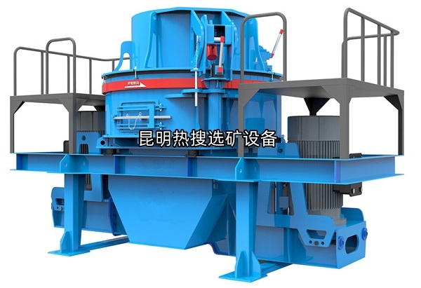 中心进料伴随环形瀑落进料(“石打石”整型):物料落入制砂机进料斗,再经环形孔落下,被分料盘分成两股料,一股经分料盘进入高速旋转的转子叶轮,另一股从分料盘四周落下。进入叶轮的物料,在叶轮内被迅速加速后高速抛出,其加速度可达数十倍重力加速度,然后高速从甩轮内抛出,首先同由分料器四周自由落体的另一部分物料冲击破碎,然后一起冲击到涡流腔内涡流衬层上,被物料衬层反弹,斜向上冲击到涡流腔的顶部,又改变其运动方向,偏转向下运动,又与从叶轮流道发射出来的物料撞击形成连续的物料幕。这样,一块物料在涡流破碎腔内受到两次至多次几率撞击、摩擦和研磨破碎作用,被破碎的物料由下部排料口排出。