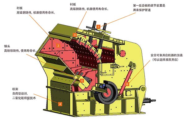 2、长寿命低成本,直线型板锤材质是高铬铸铁,带有轴对称齿,在一段磨损的情况下可掉头使用;反击衬板为折线形设计,使用视磨损情况可互调位置,以延长使用寿命,节约成本。