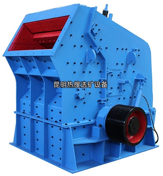 PF系列反击式破碎机是利用高速回转的板锤冲击物料进行破碎。工作时,在电动机的带动下,转子高速旋转,当物料进入破碎腔后即受到转子冲击能与反击装置撞击破碎。首先物料通过转子撞击到反击衬板上,然后返回到板锤作用区再次破碎,物料由大到小进入一、二、三反击腔重复进行破碎,最后物料经过板锤、反击板的连续多次撞击作用以及物料之间的相簿碰撞作用,便不断沿自身的节理面产生裂缝、松散而被破碎。其力度小于板锤和反击板之间的缝隙时,就从机器下部排出成为合格产品。
