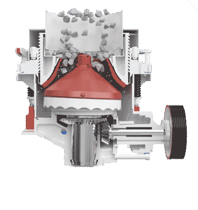 HST系列液压单缸圆锥破碎机主要由上架体、中架体(中碎型)、下架体、动锥部、偏心套部、传动部、液压缸部等部件组成。工作时,电机带动破碎机的小齿轮,小齿轮带动大齿轮,大齿轮组件(大齿轮、大齿轮架、偏心钢套)带动偏心套组件(偏心缸套、偏心铜套)和主轴组件(主轴、内锥、内锥衬板)以理论垂直线为中心,在铜衬套内公转,主轴组件在偏心铜套内以主轴的中心线可以实现自转。空机运行的时候,偏心套组件“抱着”主轴组件和随大齿轮一同公转,当物料加入到破碎腔后,主轴总成(主轴、内锥)在物料的阻力下在偏心铜套内缓慢的自转。内锥的运行轨迹看起来是在破碎腔内来回摆动,同时缓慢的旋转。物料被摆动的内锥挤压破碎。支撑套与架体连接处靠液压缸压紧,当破碎机内落入金属块等不可破碎物体时,单缸的动锥由底部液压活塞托起,起到排放口调整和过铁保护、反复起落排除堵矿的作用。从而实现连续工作,对石矿物料的破碎加工。