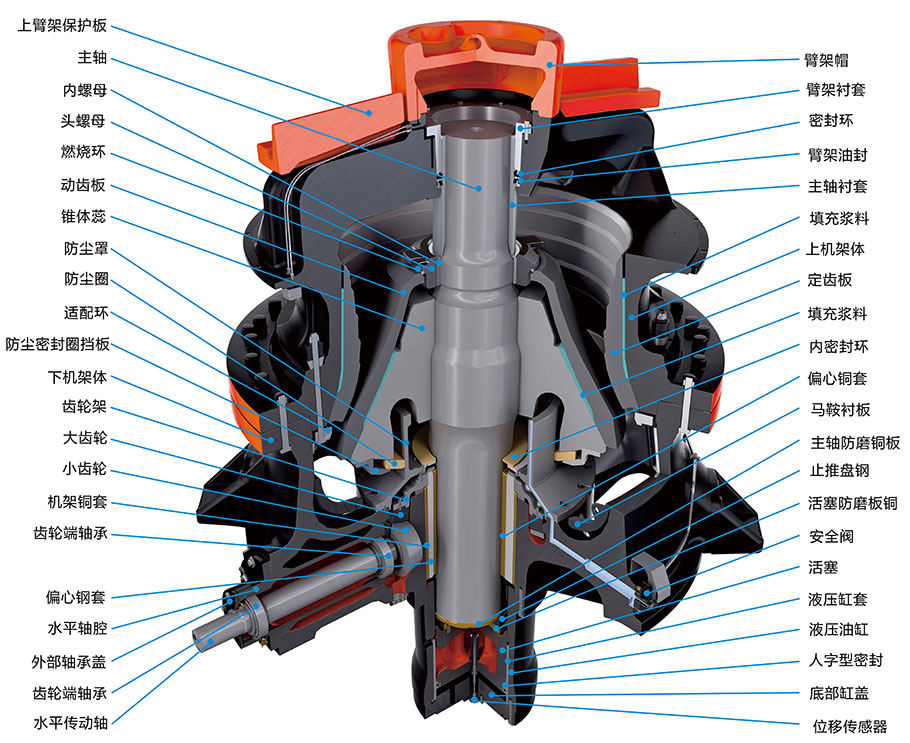 2、液压保护,液压调整系统在过铁或其他“非破碎物”通过破碎机时,会自动降低主轴、保护破碎机,等过铁排除后,再自动恢复原始设置,从而提供过载保护。该系统自动补偿破碎腔磨损,减少人工成本。