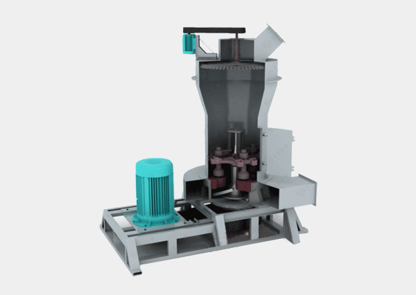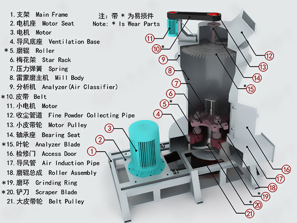物料研磨后,风机将风吹入主机壳内,吹起粉末,经置于研磨室上方的分析器进行分选,细度过粗的物料又落入研磨室重磨,细度合乎规格的随风流进入旋风收集器,收集后经出粉口排出,即为成品。风流由大旋风收集器上端的回风管回入风机,风路是循环的,并且在负压状态下流动,循环风路的风量增加部分经风机与主机中间的废气管道排出,进入小旋风收集器,进行净化处理。
