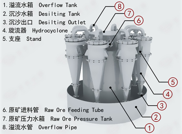 水力旋流器下部是圆锥形壳体,上部连接圆柱形壳体。圆柱形壳体上口封死,中间有一层底板,底板中央插入一短管溢流管,在底板下部沿圆柱形壳面的切线方向连接有给矿管口,在底板之上沿壳体切线方向连接有溢流排出管口,锥体最下端有可更换的沉砂排出嘴。水力旋流器多用耐磨铸铁制造,为减低壳体内壁的磨损速度,还常用辉绿岩铸石、耐磨橡胶等耐磨材料作衬里。