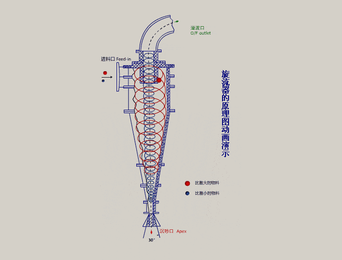 水力旋流器主要是离心沉降,当待分离的两相(或三相)混合液以一定压力从旋流器给料口进入旋流器内后,产生强烈的三维椭圆型强旋转剪切湍流运动。由于颗粒的密度不同,其受到的离心力、向心浮力、流体曳力等大小不同,受离心沉降作用,大部分粗颗粒(或重相)经旋流器底流口排出,而大部分细颗粒(或轻相)由溢流管排出,从而达到分离分级的目的。矿浆在压力作用下经给矿管沿柱体切线方向进入壳体,在壳内做回转运动,矿浆中的粗颗粒(或密度大的颗粒)因受到较大的离心力而进人回转流的外围,并同时随矿浆流向下流动,最终由底部沉砂嘴排出成为沉砂;细颗粒所受离心力较小,处于回转流中心并随液流向上运动,最后由溢流管排出成为溢流。