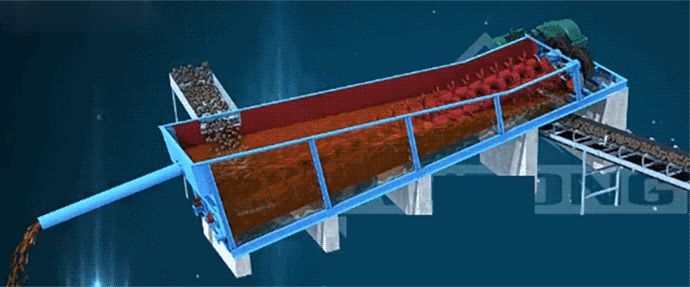 PG系列双轴洗矿机是由槽体、螺旋轴、电机、减速机等部件组成。工作时,给料是从槽体的下端给入,粘结在一起的物料泥团被洗矿叶片连续的搅拌、擦洗,并受到上端高压冲洗水的冲洗和松散作用,迫使粘性泥土与物料颗粒解离,黏士形成悬浮状态的矿浆由下部溢流槽排出,粗粒物料颗粒则受到叶片的推动作用,从洗石机上部的排料口排出。