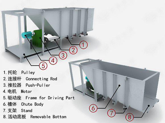 槽式给矿机主要由电动机、减速机、联轴器、偏心机构、漏板、槽架、滚轮等几个主要部件组成。其结构的共同点是均装有可控制料层高度的调节闸板;在输料槽下部为一前后移动的给料板。其不同点是给料板角度不一样,一般为沿卸料方向向下倾斜5度,以及更大的倾角(小于物料的静堆积角)和角度为零的水平型等。给料板的动作有前后往复移动式,抖动式以及摆动式等,传动机构均为曲柄回转式。