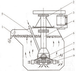 1、刮板;2、轴承体;3、电机;4、中心筒;5、吸气管;6、槽体;7、主轴;8、定子;9、叶轮。