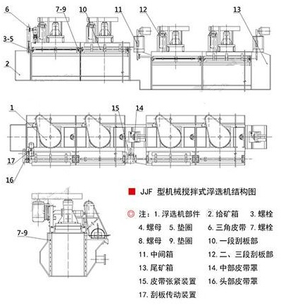 1、给矿管;2、大皮带罩;3、槽体;4、螺栓;5、螺母;6、垫圈;7、主轴部分;8、定子;9 、浮选机组合螺母;10、垫圈;11、螺栓;12、定子支撑架;13、螺栓;14、定子支架支座;15、放矿阀;16、螺栓;17、螺母;18、垫圈;19、挡板;20、三角皮带;21、螺母;左式电机装置;22、不等边角钢;23、弯头;24、钢管;25、空压胶管;26、钢管;27、通用闸阀;28、钢管;29、钢管;30、钢板;31、中矿管;32、垫片;33、螺栓;34、组合螺母;35、垫圈;36、螺栓;37、槽钢用方斜垫圈。