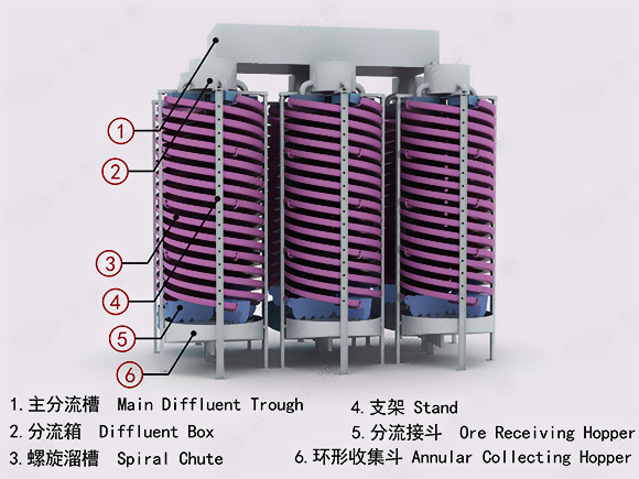 均匀的矿浆通过装在螺旋溜槽首端的给矿槽缓慢地给到螺旋槽面上,进行分选。螺旋溜槽的尾端装有阀块式产品截取槽,将分选的产品沿径向按品位分成三种。用调节阀块的位置来改变各产品的截取宽度,产品集聚斗将已截取的多头矿流分别汇集导出。螺旋溜槽的横截面,曲线的斜率变化特别适用于细微粒物料的选别。